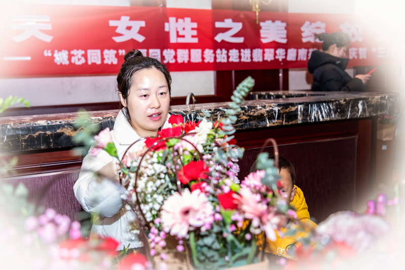活動現(xiàn)場氣氛熱烈而融洽,居民們邊向老師學習邊交流,互相分享自己的插花心得。一朵朵美麗的花朵在大家的手中綻放,仿佛也在訴說著女性的堅韌與美麗。