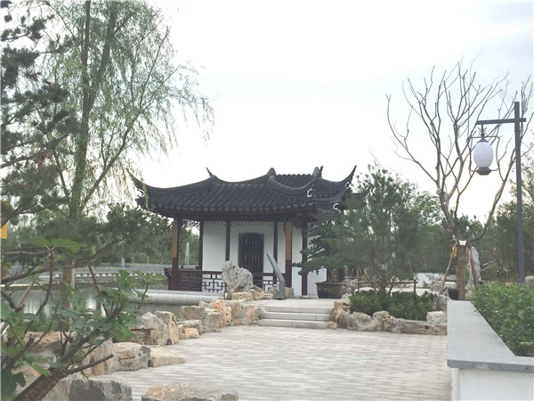 園區(qū)富民河北岸西段景觀綠化工程,位于富民河北岸(通湖大道至石公山路,石公山路至通達大道),總面積8024平方米,總投資約455萬元,整體風格為蘇式風格,借鑒蘇州園林元素,如滄浪亭、獅子林、拙政園和留園的園林特點,打造園區(qū)的“蘇式園林”。