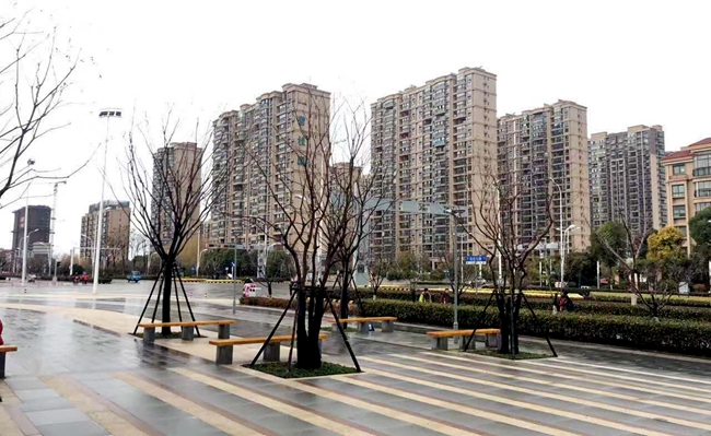 陽(yáng)澄鄰里中心景觀工程主要包括北側(cè)主廣場(chǎng)石材鋪裝和四個(gè)苗木組團(tuán)共同構(gòu)成,其中綠化組團(tuán)由主廣場(chǎng)樹(shù)陣、西側(cè)生態(tài)停車場(chǎng)綠化帶、鄰里中心主入口區(qū)及南側(cè)卸貨區(qū)。苗木主要有櫸樹(shù)、烏桕、香樟、樸樹(shù)、柿樹(shù)等,整體觀感做到四季有賞、落葉常綠分明。