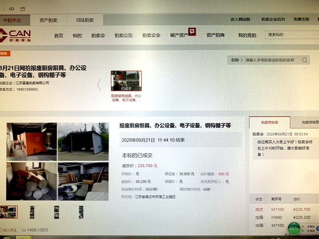 8月21日上午10時(shí),城發(fā)公司報(bào)廢廚具、辦公設(shè)備、電子設(shè)備、鋼構(gòu)棚子等物資網(wǎng)上拍賣開(kāi)始,7家競(jìng)買人,經(jīng)過(guò)1小時(shí)44分10秒244次的緊張激烈競(jìng)價(jià),最終以228700元成交標(biāo)的,比評(píng)估價(jià)90200元高出138500元,溢價(jià)率153.55%。
