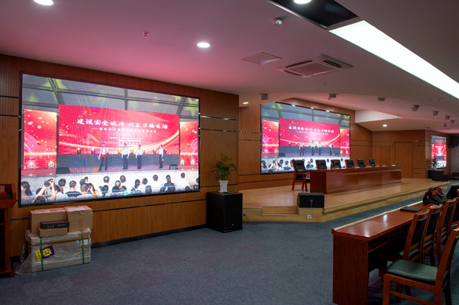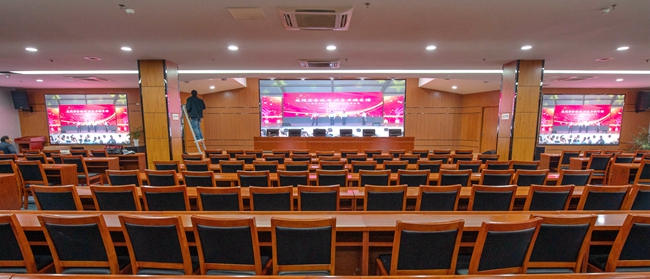 經(jīng)過改造,安全教育館新增3塊LED屏幕,其中主席臺處主LED顯示屏面積約20平方,東西兩側(cè)輔助LED顯示屏各約6平方。LED屏幕采用顯示單元像素間距為P2-2.5,具有顯示面積大、分辨率高、超高對比度、超寬視角、無縫拼接、維護(hù)方便等優(yōu)點。改造后進(jìn)一步提升了視頻會議效果,增加了會場多功能性。
