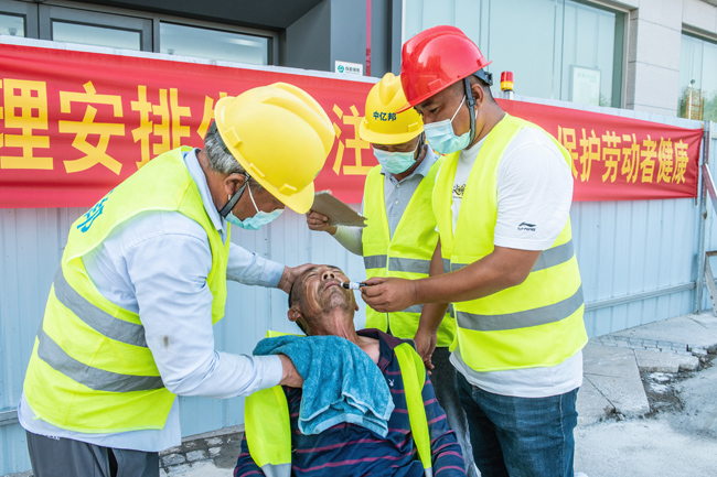 此次演練是模擬工人在戶外作業(yè)時發(fā)生中暑后的現(xiàn)象以及如何進行急救的。演練現(xiàn)場,演練示范人員按照應急預案對“中暑”的員工進行緊急施救,首先發(fā)現(xiàn)中暑人員后將其迅速轉移到陰涼通風的地方,移動、冷敷、擦浴、降溫、補水......各項救援措施緊張有序。整個演練過程歷時30多分鐘,中暑人員在急救小組的緊密合作下,及時得到救治。