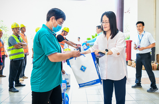 “大家在做好本職工作同時(shí),注意保重身體,防暑措施一定要做到位,確保安全生產(chǎn)。”在明日鄰里中心慰問現(xiàn)場(chǎng),李蘭霞與物業(yè)員工們親切交談,感謝他們?yōu)楣景l(fā)展和民生保障付出的辛勤努力,反復(fù)叮囑大家要提高夏日防暑意識(shí),做好自我防護(hù),確保以更好的狀態(tài)投入到工作中。現(xiàn)場(chǎng)強(qiáng)調(diào)各部門要守牢安全底線,做好高溫時(shí)節(jié)各項(xiàng)工作,普及好防暑降溫和急救知識(shí),確保廣大一線職工的安全。