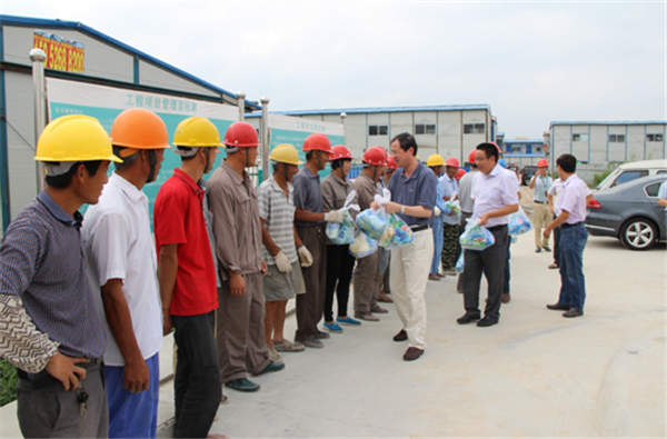 8月11日上午,園區(qū)黨工委委員、規(guī)劃建設(shè)局局長周原帶隊來到夢家園、許莊變、2014年市政二標(biāo)等項目工地,檢查防暑降溫措施落實情況,并慰問奮戰(zhàn)在高溫一線的建筑工人。