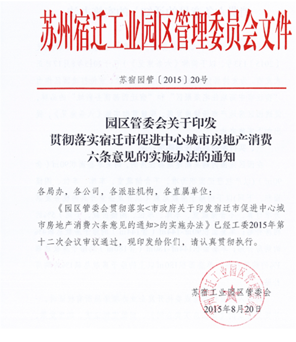 8月20日,在市政府出臺《宿遷市促進中心城市房地產消費六條意見》之后的第三天,園區(qū)率先出臺了《園區(qū)管委會貫徹落實<市政府關于印發(fā)宿遷市促進中心城市房地產消費六條意見的通知>的實施辦法》。