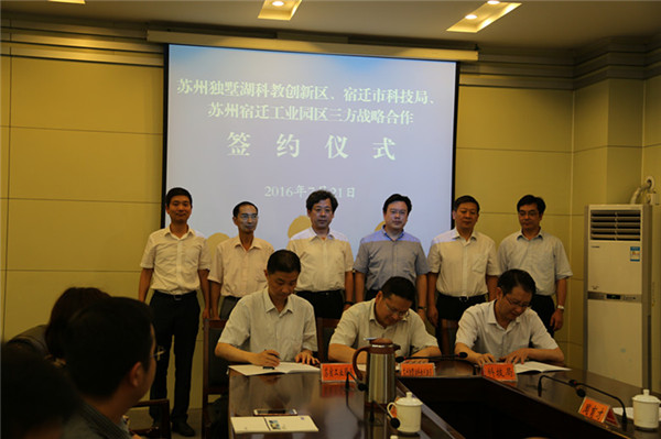 7月21日下午,蘇州獨(dú)墅湖科教創(chuàng)新區(qū)管委會(huì)、宿遷市科學(xué)技術(shù)局、蘇州宿遷工業(yè)園區(qū)管委會(huì)三方戰(zhàn)略合作協(xié)議簽約儀式在宿遷舉行。根據(jù)協(xié)議,三方將在科技資源轉(zhuǎn)移、科技平臺(tái)建設(shè)以及科技環(huán)境優(yōu)化等方面推進(jìn)合作。這是蘇宿兩地合作內(nèi)涵逐步深化、合作領(lǐng)域不斷拓寬、合作水平全面提升的重要體現(xiàn),更是深入貫徹落實(shí)省委、省政府部署的重要舉措。市委副書記、市長王天琦,副市長、蘇宿工業(yè)園區(qū)黨工委書記、管委會(huì)主任方文浜,市政府秘書長章其波見證簽約。